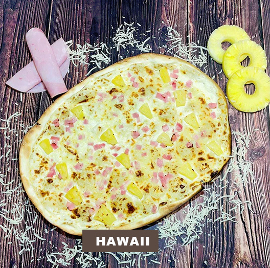 Variante B: HAWAII mit hausgemachter deftiger Crème, gekochtem Schinken, Ananas und Emmentaler-Käse.