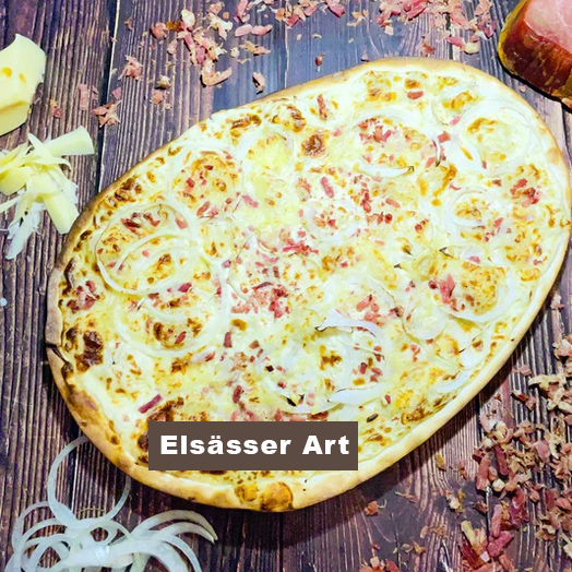 Variante A: Elsässer Art mit hausgemachter deftiger Crème, Speck und Zwiebeln.